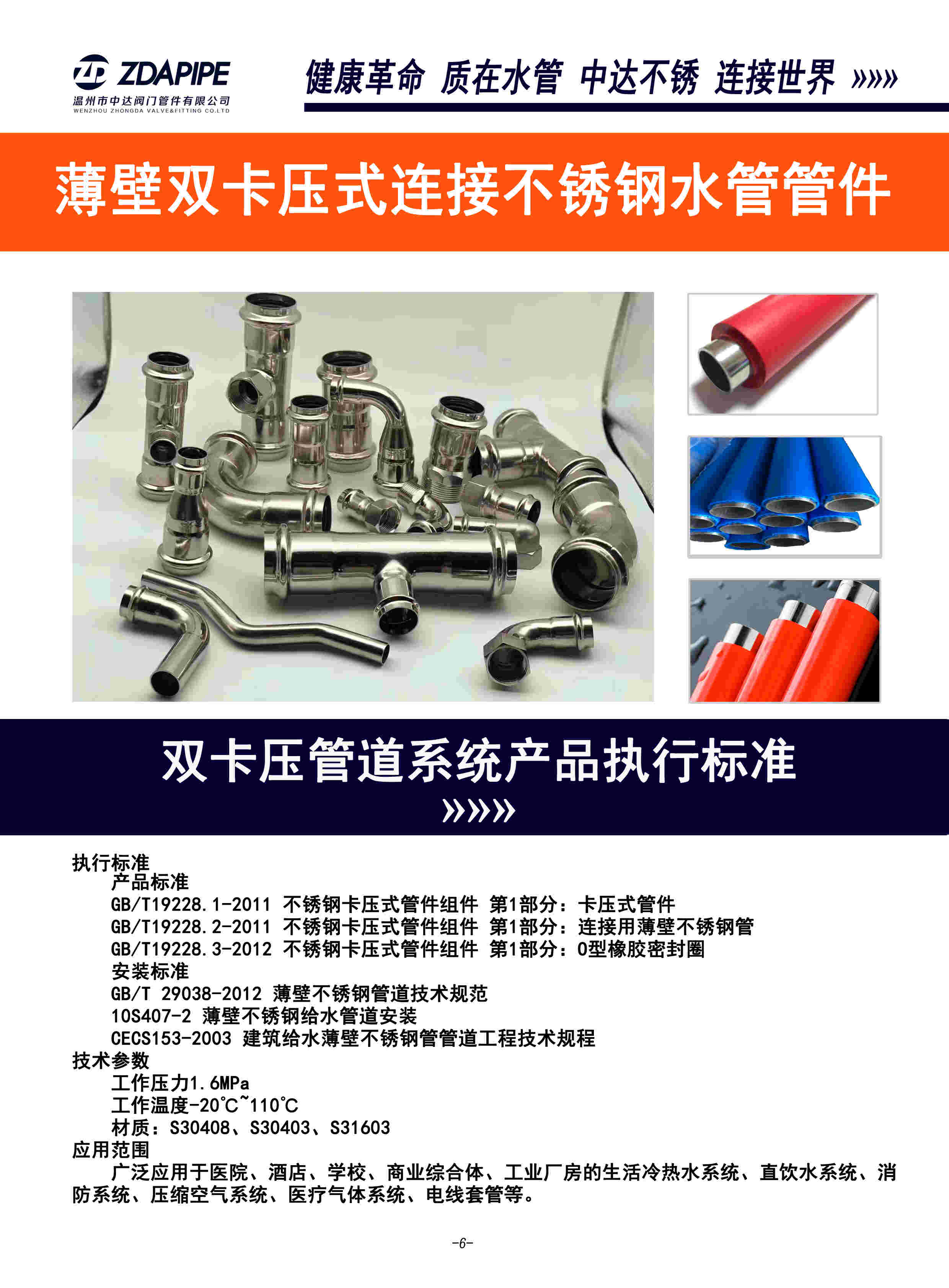 雙卡壓管件廣泛應(yīng)用于市政自來水管道工程,新建小區(qū)直飲水工程,工業(yè)與民用 建筑、賓館、公共建筑、睬氣供應(yīng)等分供水系統(tǒng)。給水,排水,二次供水,太陽能,水務(wù)工程,自來水公司,醫(yī)院,學(xué)校,酒店,賓館,天然氣工程,自來水工程,直飲水工程,家裝水管工程,工業(yè)管道工程,水處理工程,清潔能源工程,綠色能源,核電等領(lǐng)域。健康革命,質(zhì)在水管,中達不銹,連接世界。